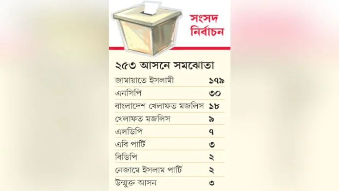 ফলে হাতপাখার সঙ্গে সমঝোতা হলে দাঁড়িপাল্লা থাকবে ১৮৩ আসনে। যদিও যে তালিকা ঘোষণা করা হয়েছে, তাতে জামায়াতের প্রার্থী সংখ্যা ১৮২ এবং এনসিপির ২৭। তবে এর আগে এনসিপিকে তিনটি আসন ছাড়া হয়। তবে এগুলো কোন কোন আসন, তা গতকাল রাত পর্যন্ত ঘোষণা করা হয়নি। সমঝোতা অনুযায়ী, এনসিপি ৩০, দুটি উন্মুক্তসহ মামুনুল হকের নেতৃত্বাধীন বাংলাদেশ খেলাফত মজলিস ২০, একটি উন্মুক্তসহ খেলাফত মজলিসের অপরাংশ ১০, এলডিপি ৭, এবি পার্টি তিন এবং নেজামে ইসলাম পার্টি ও বিডিপি দুটি করে আসনে নির্বাচনে প্রতিদ্বন্দ্বিতা করবে। ঐক্যের অপর দুই শরিক জাগপা এবং খেলাফত আন্দোলন কোনো আসন পাচ্ছে না। দল দুটিকে ভবিষ্যতে উচ্চকক্ষে আসন দেওয়ার প্রতিশ্রুতি দেওয়া হয়েছে।