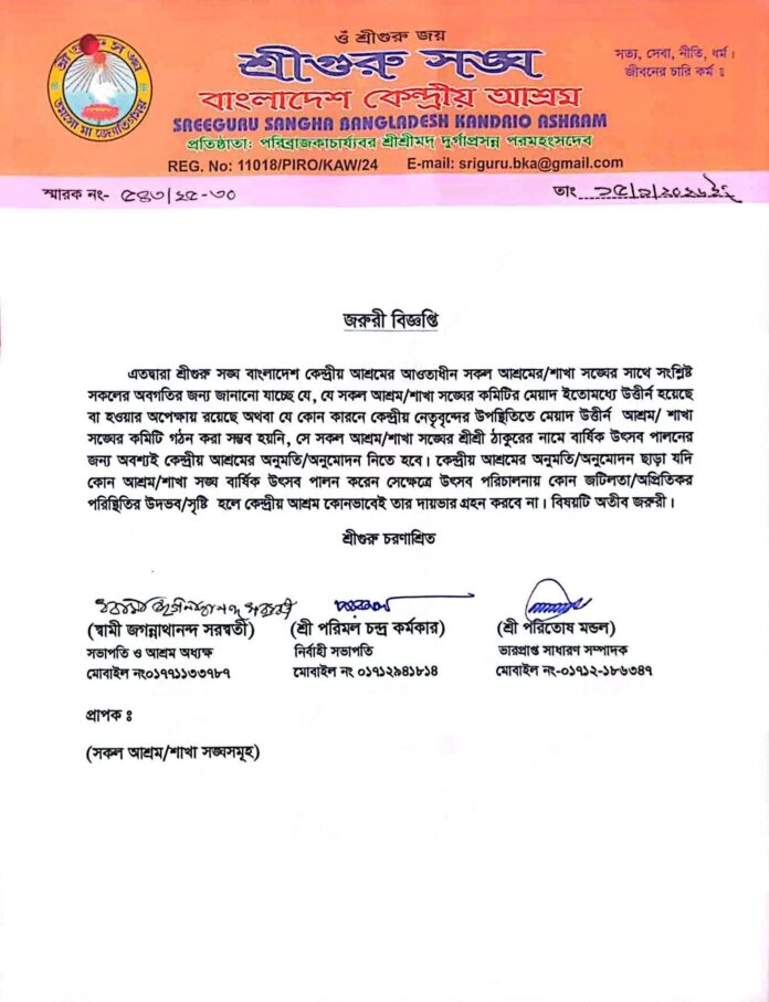 শ্রীগুরু সংঘ কেন্দ্রীয় আশ্রমের সভাপতি ও আশ্রম অধ্যক্ষ স্বামী জগন্নাথানন্দ সরস্বতী, নির্বাহী সভাপতি শ্রী পরিমল চন্দ্র কর্মকার এবং ভারপ্রাপ্ত সাধারণ সম্পাদক শ্রী পরিতোষ মণ্ডল স্বাক্ষরিত প্রজ্ঞাপনে শ্রীগুরু সংঘ বাংলাদেশ কেন্দ্রীয় আশ্রমের আওতাধীন সকল আশ্রম/শাখা সংঘের সাথে সংশ্লিষ্ট সকলের জ্ঞাতার্থে জানানো হয় যে সকল আশ্রম/শাখা সংঘের কমিটির মেয়াদ ইতিমধ্যে উত্তীর্ণ হয়েছে বা হওয়ার অপেক্ষায় অথবা যেকোনো কারনে কেন্দ্রীয় নেতৃবৃন্দের উপস্থিতি ছাড়া কমিটি করা সম্ভব হয়নি সেসকল শাখা সংঘের অনুষ্ঠান আয়োজনে অবশ্যই কেন্দ্রীয় কমিটির অনুমোদন নিতে হবে। বিষয়টি অতীব জরুরি উল্লেখ করে প্রজ্ঞাপনে আরও বলা হয় অনুমোদন ব্যাতীত কোনো জটিল পরিস্থিতির সৃষ্টি হলে কেন্দ্রীয় আশ্রম কোনভাবেই দায় বহন করবেনা।