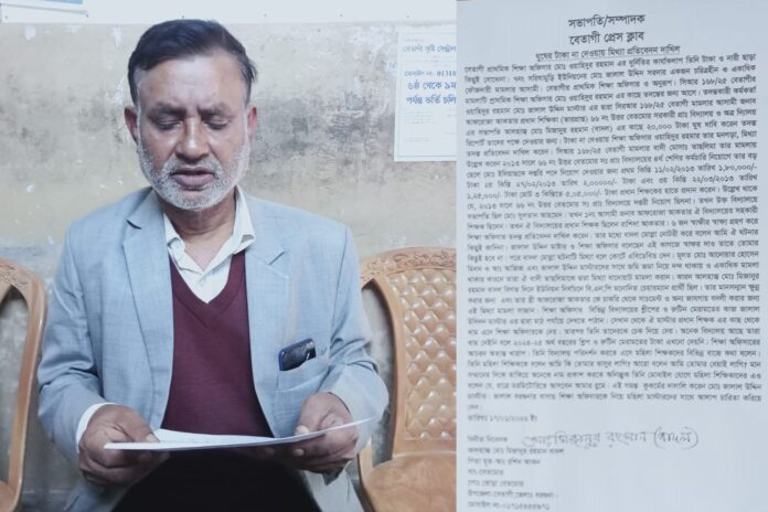 উপজেলার বেতমোর সরকারি প্রাথমিক বিদ্যালয়ের ম্যানেজিং কমিটির সভাপতি মো. মিজানুর রহমান বাদল লিখিত অভিযোগে জানান, সিআর ১৬৮/২৫ (বেতাগী) মামলার তদন্তভার পড়ে শিক্ষা অফিসার ওয়াহিদুর রহমানের ওপর। তদন্ত চলাকালীন জালাল উদ্দিন মাস্টারের মাধ্যমে শিক্ষা অফিসার মামলার বিবাদী বেতাগীর উত্তর বেতমোর সরকারি প্রাথমিক বিদ্যালয়ের ভারপ্রাপ্ত প্রধান শিক্ষিকা আফরোজা আকতার এবং বিদ্যালয় ম্যানেজিং কমিটির সভাপতি মো. মিজানুর রহমান বাদলের কাছে ২০ হাজার টাকা ঘুষ দাবি করেন। ঘুষ দিতে অস্বীকৃতি জানানোয় তিনি বাদীর পক্ষ নিয়ে একটি ‘মনগড়া ও ভিত্তিহীন’ তদন্ত প্রতিবেদন আদালতে দাখিল করেন।