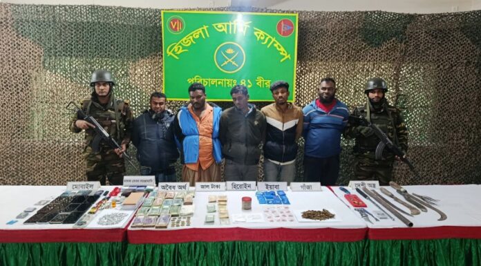 সেনাবাহিনী সন্ত্রাসী অভিযানে বরিশালের হিজলা উপজেলায় ৫ জন সন্ত্রাসী কে আটক করা হয়েছে। বুধবার দিবাগত রাতব্যাপী উপজেলার ধুলখোলা ইউনিয়নের মাটিয়ালা গ্রামে এ অভিযান পরিচালনা করা হয়। তখন দেশীয় অস্ত্র মাদকদ্রব্য গাঁজা হিরোইন ইয়াবা দেশী-বিদেশী মুদ্রা নগদ অর্থ উদ্ধার করা হয়েছে।