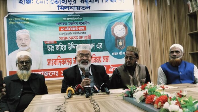 কলাপাড়া (পটুয়াখালী) প্রতিনিধি : ন্যায় ও ইনসাফ ভিত্তিক এবং দুর্নীতিমুক্ত সমাজ গড়ার লক্ষ্যে ১১৪ পটুয়াখালী—৪ (কলাপাড়া— রাঙ্গাবালী) আসনে ১০ দলীয় জোট নির্বাচনি ঐক্যের খেলাফত মজলিশ মনোনীত ঘড়ি প্রতিকের প্রার্থী ডাঃ জহির উদ্দিন আহমেদ’র সাথে সাংবাদিকদের মতবিনিময় সভা অনুষ্ঠিত হয়েছে। বৃহস্পতিবার দুপুর দেড়টায় কলাপাড়া প্রেসক্লাবের ইঞ্জি: তৌহীদুর রহমান মিলনায়তনে ১০ দলীয় নির্বাচনি ঐক্য এ মতবিনিময় সভার আয়োজন করে।