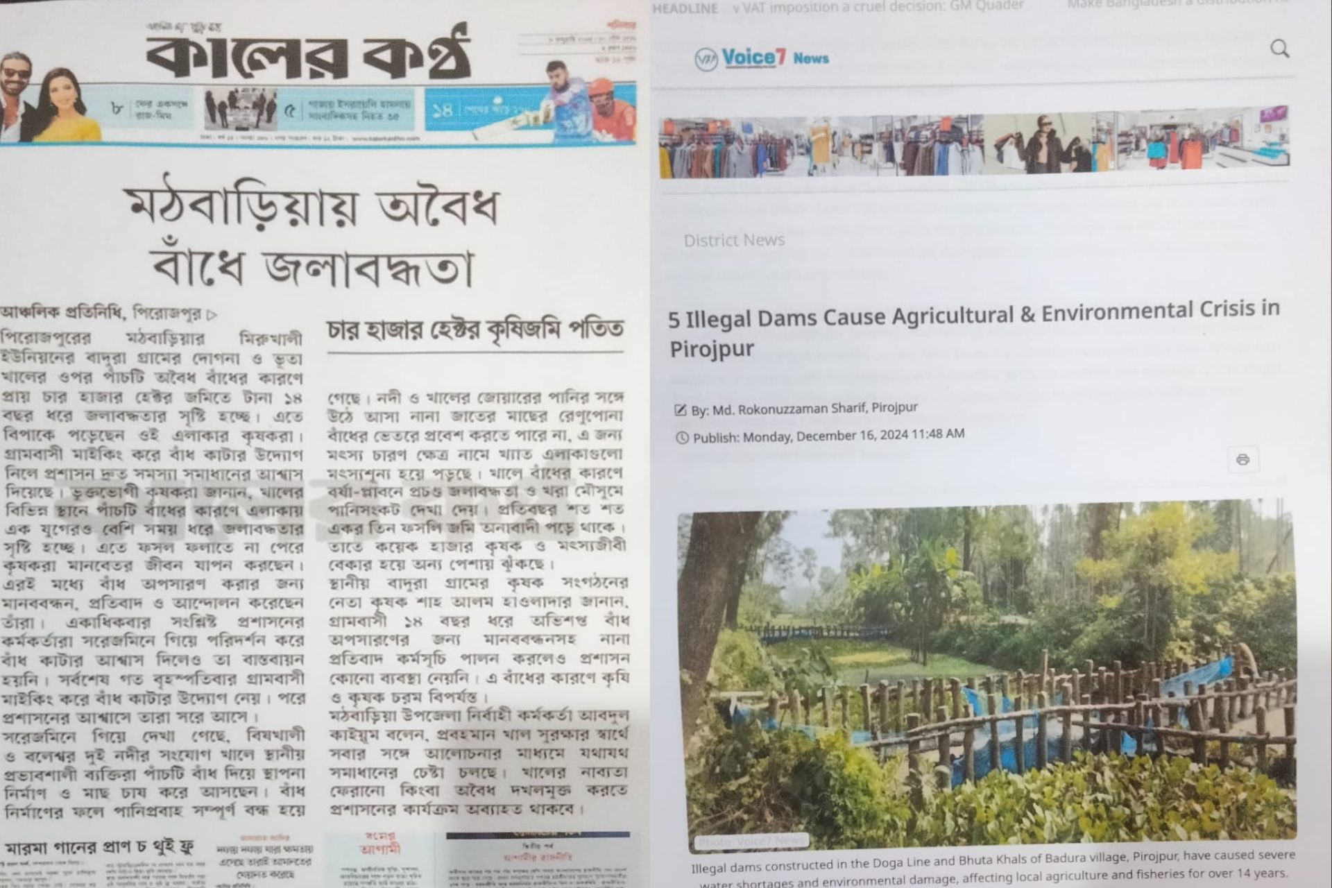 সাথে আরো যুক্ত করছি–জনস্বার্থে বলা, লেখার জন্য যদি আমার কোন অপরাধে দোষী হয়ে থাকি তাহলে ক্ষমা প্রার্থনা ছাড়া আমার অন্য কোন পথ নেই। যেখানে নদী ছিল জীবনের উৎস, সেখানে আজ বাঁধ হয়ে দাঁড়িয়েছে মৃত্যুর দেয়াল। যেখানে পানি ছিল আশীর্বাদ, সেখানে আজ সেই পানিই অভিশাপ।প্রশ্ন জাগে—এই রাষ্ট্রে কি আদৌ কোনো সরকার আছে? জনসেবার জন্য কি সরকারি কর্মকর্তারা আছেন? থাকলে এই দুর্ভোগ দেখার দায়িত্ব কার? পিরোজপুর জেলার মঠবাড়িয়া উপজেলায় মিরুখালী ইউনিয়নের বাদুরা গ্রামে বিষখালী ও বলেশ্বর দুই নদীর সংযোগ প্রায় ২৫ কিলোমিটার দীর্ঘ একটি ঐতিহাসিক খাল রয়েছে।
