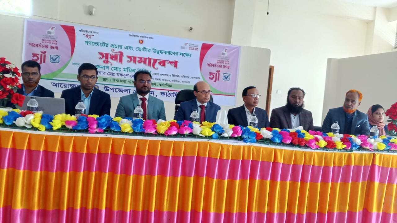 ঝালকাঠি প্রতিনিধি, মো: মেহেদী হাসান : ঝালকাঠির কাঁঠালিয়ায় আসন্ন গণভোট উপলক্ষ্যে জনসচেতনতা বৃদ্ধি, ব্যাপক প্রচার এবং ভোটারদের ভোটকেন্দ্রে উপস্থিত হতে উদ্বুদ্ধ করার লক্ষ্যে এক বিশাল সুধী সমাবেশ অনুষ্ঠিত হয়েছে। বৃহস্পতিবার সকালে উপজেলা পরিষদ অডিটোরিয়ামে এই সমাবেশের আয়োজন করা হয়। অনুষ্ঠানে প্রধান অতিথি হিসেবে উপস্থিত ছিলেন ঝালকাঠির জেলা প্রশাসক ও রিটার্নিং কর্মকর্তা জনাব মমিন উদ্দিন। তিনি তার বক্তব্যে বলেন, “গণভোট গণতান্ত্রিক প্রক্রিয়ার একটি অবিচ্ছেদ্য অংশ।