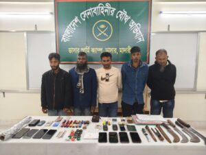 অভিযানে ৫ পিস ইয়াবা, ৮টি দেশীয় অস্ত্র, নগদ ২ হাজার ৩০৬ টাকা, ১২টি মোবাইল ফোন, একটি ডেবিট কার্ড, একটি পাসপোর্ট ও দুটি অবৈধ জাতীয় পরিচয়পত্র উদ্ধার করা হয়।
