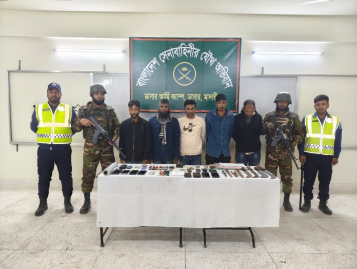 আটকরা হলেন— সাইফুল ইসলাম (৩৪), হান্নান (৪৬), শিপন শেখ (৪০), হানিফ খান (৩৬) ও শিপন ফকির (৩০)। সেনাবাহিনী সূত্র জানায়, মাদক ও সন্ত্রাসের বিরুদ্ধে জিরো টলারেন্স নীতিতে অভিযান অব্যাহত থাকবে।