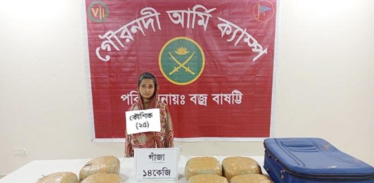 বরিশালের গৌরনদীতে সেনাবাহিনীর বিশেষ অভিযানে ১৪ কেজি গাঁজাসহ তৃতীয় লিঙ্গের (হিজড়া সম্প্রদায়) একজনকে আটক করা হয়েছে। ঢাকা-বরিশাল মহাসড়কের গৌরনদী বাসস্ট্যান্ডে বুধবার (২৮ জানুয়ারি) দিবাগত রাত সাড়ে এগারোটার দিকে তল্লাশি অভিযানকালে কৌশিক (২৫) নামের তৃতীয় লিঙ্গের ওই মাদক কারবারিকে আটক করা হয়। এ সময় তার কাছ থেকে ১৪ কেজি গাঁজা উদ্ধার করা হয়েছে।