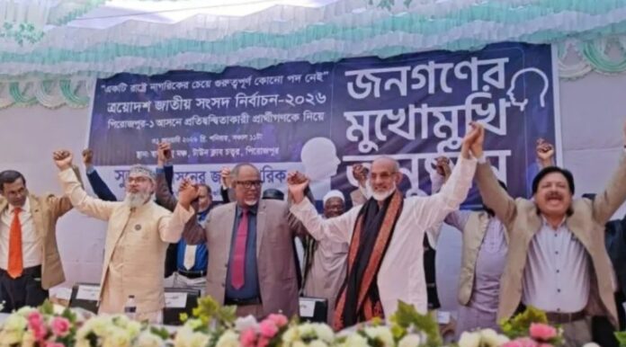 জাতীয় সংসদ নির্বাচনকে সামনে রেখে পিরোজপুরে জনতার মুখোমুখি অনুষ্ঠানে একই মঞ্চে জামায়াত ও বিএনপি’র প্রার্থীকে দেখা গেছে। এ সময় সাধারণ মানুষের বিভিন্ন প্রশ্নের উত্তর এবং এলাকার উন্নয়নের নানা প্রতিশ্রুতি দিলেন প্রার্থীরা।