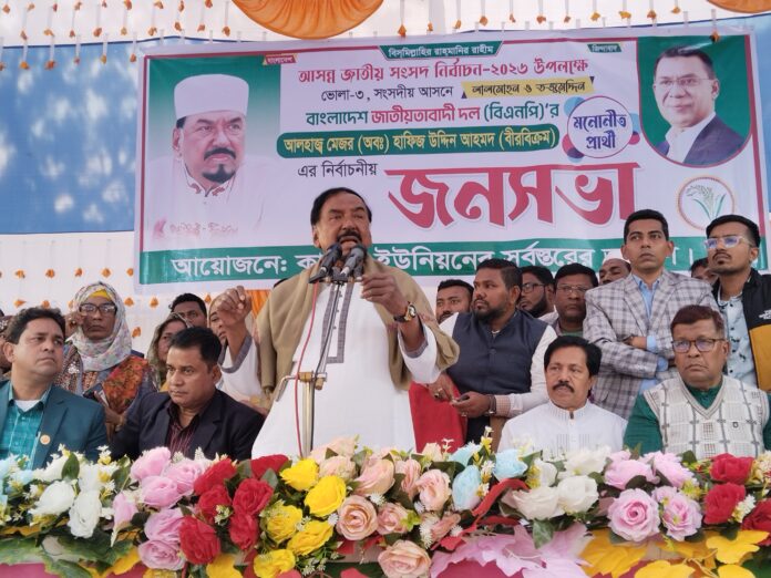 শনিবার (৩১ জানুয়ারি) বিকেলে ভোলার লালমোহন উপজেলার কালমা ইউনিয়নের ডাওরীহাট মাধ্যমিক বিদ্যালয়ের মাঠে নির্বাচনী জনসভায় প্রধান অতিথির বক্তব্যে এসব মন্তব্য করেন,বিএনপি’র স্থায়ী কমিটির সদস্য ও ভোলা-৩ আসনের এমপি প্রার্থী মেজর (অব.) হাফিজ উদ্দিন আহমেদ বীরবিক্রম।