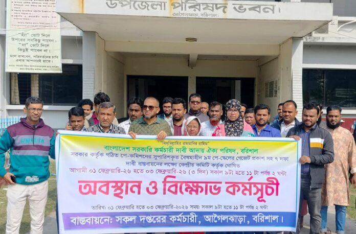 আগৈলঝাড়া (বরিশাল) প্রতিনিধিঃ ৯ম পে—স্কেলের গেজেট প্রকাশসহ ৭দফা দাবী বাস্তবায়নের লক্ষ্যে বরিশালের আগৈলঝাড়ায় অবস্থান ও বিক্ষোভ কর্মসূচি পালিত হয়েছে। গতকাল সোমবার সকালে উপজেলা সরকারি সকল দপ্তরের কর্মচারীদের উদ্যোগে পরিষদ চত্বরে বিক্ষোভ কর্মসূচি অনুষ্ঠিত হয়।