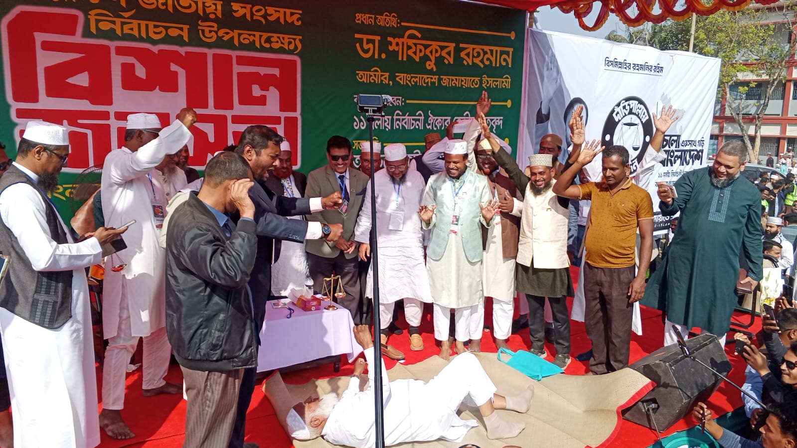 মঞ্চেই পাটি বিছিয়ে শুয়ে পড়েন এবং বিশ্রাম নেন কিছুক্ষণ। এ সময় উপহারদাতাদের বুকে জড়িয়ে ধরেন ডা. শফিকুর রহমান। রাজনীতির উর্ধ্বে উঠে এমন অকৃত্রিম ভালোবাসা ও সম্প্রীতির চিত্র দেখে উপস্থিত নেতা-কর্মী ও সাধারণ মানুষ করতালি দিয়ে তাকে অভিনন্দন জানান। “আমরা সাধারণত নেতাদের অনেক গম্ভীর দেখি, কিন্তু আমিরে জামায়াতের এই সাধারণ মানুষের মতো আচরণ আমাদের মুগ্ধ করেছে। বিশেষ করে অন্য ধর্মের মানুষের উপহারকে তিনি যেভাবে সম্মান দিলেন, তা সত্যি বিরল।”