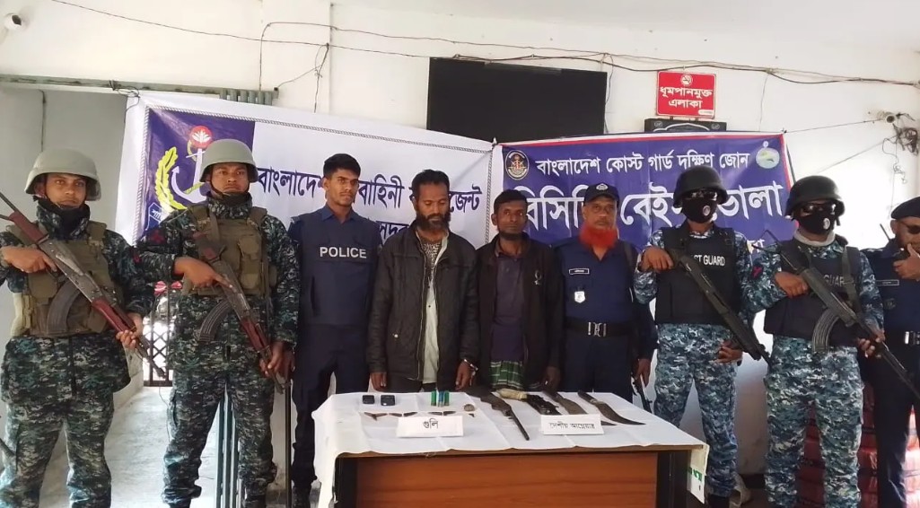 গ্রেপ্তার দুজন হলেন, হাসান (৪২) ও সেলিম (৪৪)। তারা ভোলা সদর উপজেলার ধনিয়া ইউনিয়নের বাসিন্দা। নৌবাহিনী সূত্রে জানা গেছে, ত্রয়োদশ জাতীয় সংসদ নির্বাচনে প্রভাব বিস্তার করতে সংঘবদ্ধ একটি চক্র তৎপর রয়েছে।
