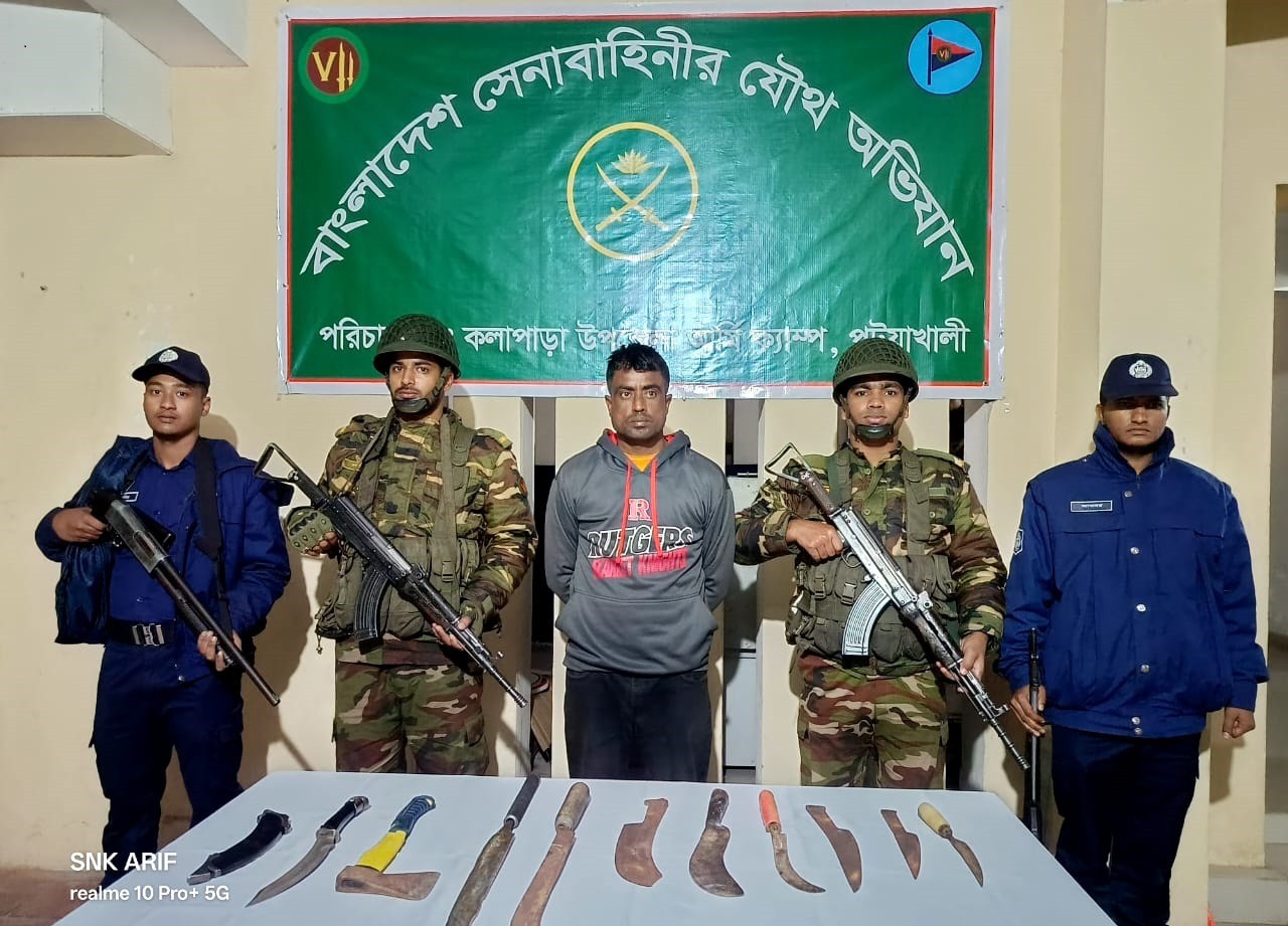 ৩টি ছুরি ও ৩টি দা উদ্ধার করা হয়। গতকাল শনিবার গভীর রাতে এ অভিযান পরিচালনা করা হয়। পায়রা আর্মি ক্যাম্প সূত্রে জানা গেছে, গোয়েন্দা তথ্যের ভিত্তিতে কলাপাড়া পৌর শহরের বাদুরতলী এলাকায় এ অভিযান পরিচালিত হয়। ৫২ এমএলআরএস ব্যাটালিয়ানের অধীন গভীর রাতে কলাপাড়া থানা পুলিশের সাথে যৌথ অভিযান পরিচালিত হয়।