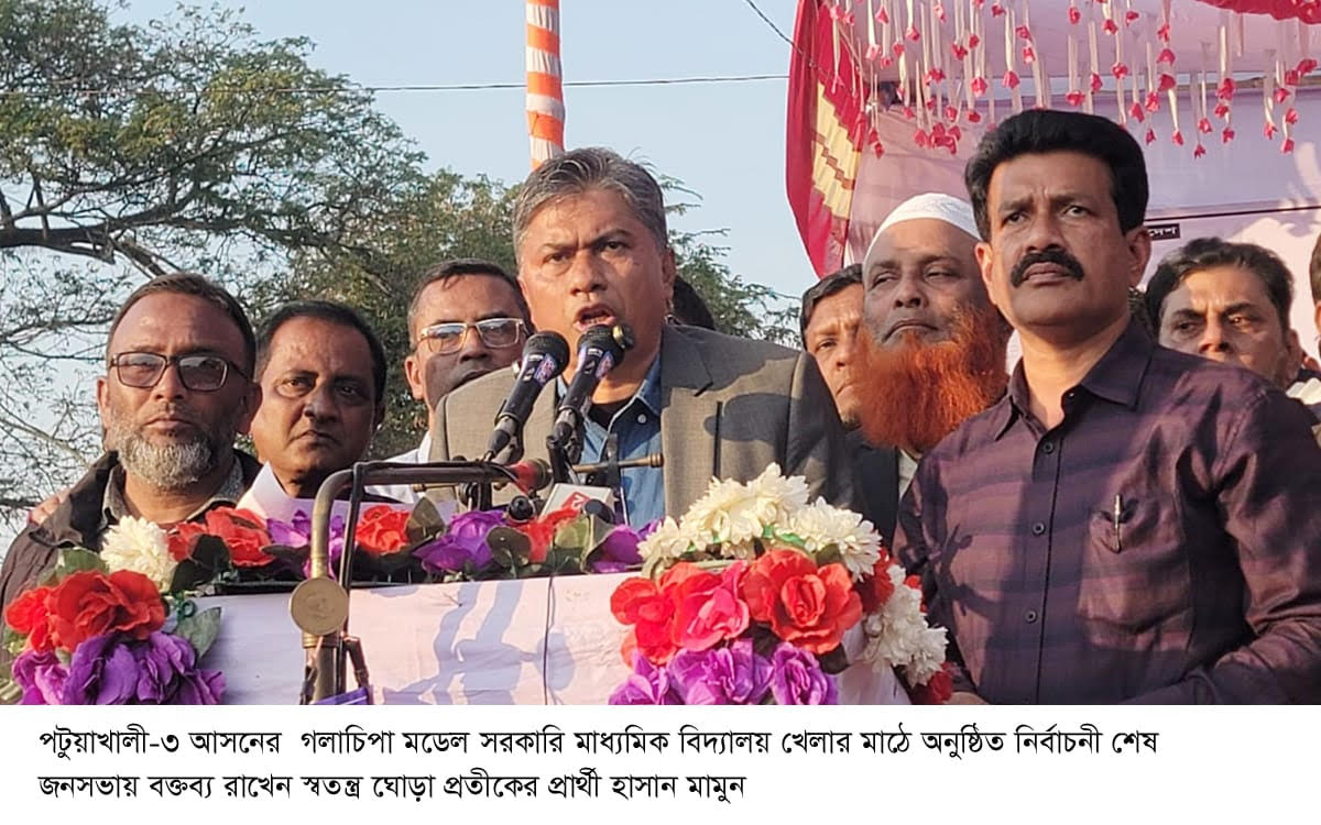 ফেরিঘাট ও অবকাঠামো উন্নয়নসহ জনগণের স্বার্থবিরোধী কোনো কাজ হতে দেওয়া হবে না। এ বিষয়ে সংশ্লিষ্ট সকলের সঙ্গে আলোচনা চলছে এবং আমরা সবসময় আপনাদের পাশে থাকব।” রবিবার (৮ ফেব্রুয়ারী) বিকেল ৪টায় গলাচিপা মডেল সরকারি মাধ্যমিক বিদ্যালয়ের খেলার মাঠে অনুষ্ঠিত নির্বাচনী প্রচারণার শেষ জনসভায় প্রধান অতিথির বক্তব্যে এসব কথা বলেন পটুয়াখালী-৩ আসনের আলোচিত স্বতন্ত্র প্রার্থী ও কেন্দ্রীয় বিএনপির কার্যনির্বাহী কমিটির সাবেক সদস্য হাসান মামুন। হাসান মামুন বলেন, বাংলাদেশ একটি গণতান্ত্রিক রাষ্ট্র। এখানে সব ধর্ম ও বর্ণের মানুষের অধিকার সমান। সাম্প্রদায়িক উস্কানির বিরুদ্ধে আমরা কঠোর অবস্থানে আছি এবং প্রতিটি ঘটনার বিচার হবে।