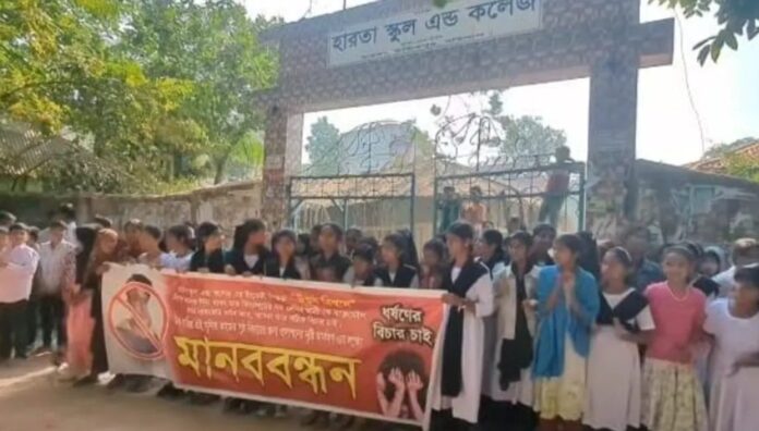 এদিকে সহপাঠীকে ‘চুমু’ দেওয়ার ঘটনার প্রতিবাদ এবং অভিযুক্ত শিক্ষক উত্তম কুমারকে বরখাস্তসহ দৃষ্টান্তমূলক শাস্তির দাবিতে সোমবার দুপুরে ক্লাস বর্জন করে হারতা স্কুল ও কলেজের সামনে মানববন্ধন করে শিক্ষার্থীরা। শিক্ষার্থীদের বিক্ষোভের পর পরই বিকেলে অভিযুক্ত শিক্ষক উত্তম কুমারকে হারতা স্কুল অ্যান্ড কলেজ থেকে সাময়িকভাবে বরখাস্ত করে স্কুল এন্ড কলেজ কর্তৃপক্ষ।