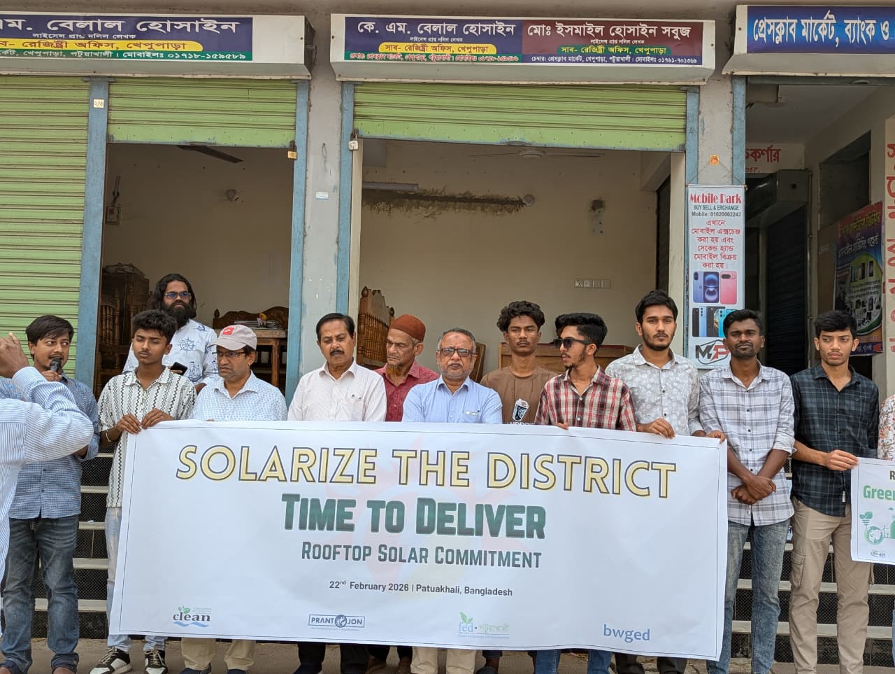 রোববার পটুয়াখালীর কলাপাড়াতে প্রান্তজন ট্রাস্ট , প্রতিবেশ ও উন্নয়ন ফোরাম পটুয়াখালী (ফেড – পটুয়াখালী), ক্লিন, বিডাব্লিউজিইডি এবং স্থানীয় কমিউনিটি প্ল্যাটফর্মসমূহের যৌথ উদ্যোগে আয়োজিত এক বিশাল মোবিলাইজেশন কর্মসূচিতে বক্তারা বলেন, স্থানীয় সরকার প্রতিষ্ঠানসমূহের সক্রিয় সমর্থন ও সরাসরি অংশগ্রহণ ছাড়া নবায়নযোগ্য জ্বালানির লক্ষ্যমাত্রা অর্জন সম্ভব নয়। সমাবেশে স্থানীয় সাংবাদিক, যুব প্রতিনিধি এবং পরিবেশ আন্দোলনের কর্মীরা অংশ নিয়ে জ্বালানি খাতের এই পরিবর্তনের পক্ষে সংহতি প্রকাশ করেন। পরবর্তীতে একটি প্রতিনিধি দল কলাপাড়া পৌরসভার প্রশাসক কাউছার হামিদের কাছে একটি স্মারকলিপি জমা দেয়।