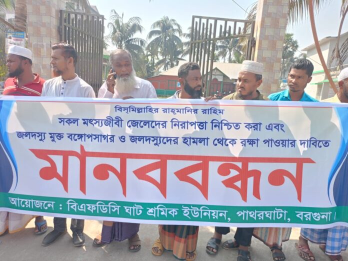 গত কয়েকদিন ধরে সাগর ও নদীতে জেলে বহরে হামলা, লুটপাট, অপহরণ ও গুলিবর্ষণের একাধিক ঘটনা ঘটেছে। এ পরিস্থিতিতে জলদস্যুদের বিরুদ্ধে প্রতিবাদ জানিয়ে আজ পাথরঘাটায় মানববন্ধন করেছে বরগুনা জেলা মৎস্যজীবী ট্রলার মালিক সমিতি, বিএফডিসি মৎস্য আড়ৎদার সমিতি, বিএফডিসি মৎস্য পাইকার সমিতি, বরগুনা জেলা ফিশিং ট্রলার শ্রমিক ইউনিয়ন এবং বিএফডিসি মৎস্য বাজার ঘাট শ্রমিক ইউনিয়নসহ কয়েক হাজার মৎস্যজীবী।