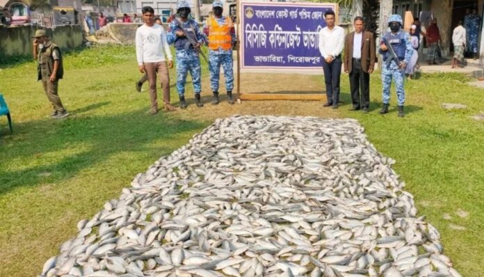 পিরোজপুরের ভাণ্ডারিয়ায় জাটকা সংরক্ষণে বিশেষ অভিযান চালিয়ে দুটি মাছ ধরার ট্রলার জব্দ করেছে বাংলাদেশ কোস্ট গার্ড। এ সময় ট্রলার দুটিতে তল্লাশি চালিয়ে প্রায় ১০ মণ জাটকা মাছসহ তিন জেলেকে গ্রেপ্তার করা হয়। শুক্রবার (২৭ ফেব্রুয়ারি) ভোর ৬টার দিকে উপজেলার কঁচা নদী এলাকায় অভিযান চালিয়ে ‘এফ বি মায়ের দয়া’ ও ‘এফ বি সোলায়মান’ নামের দুটি ট্রলার জব্দ করা হয়।