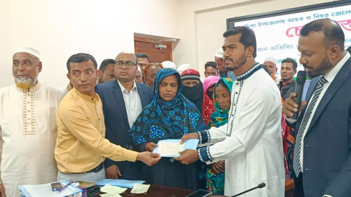 গণপ্রজাতন্ত্রী বাংলাদেশ সরকারের শ্রম ও কর্মসংস্থান এবং প্রবাসী কল্যাণ ও বৈদেশিক কর্মসংস্থান মন্ত্রণালয়ের প্রতিমন্ত্রী মো. নুরুল হক নুর নিজ হাতে ভুক্তভোগীদের মাঝে এই আর্থিক সহায়তার চেক হস্তান্তর করেন।