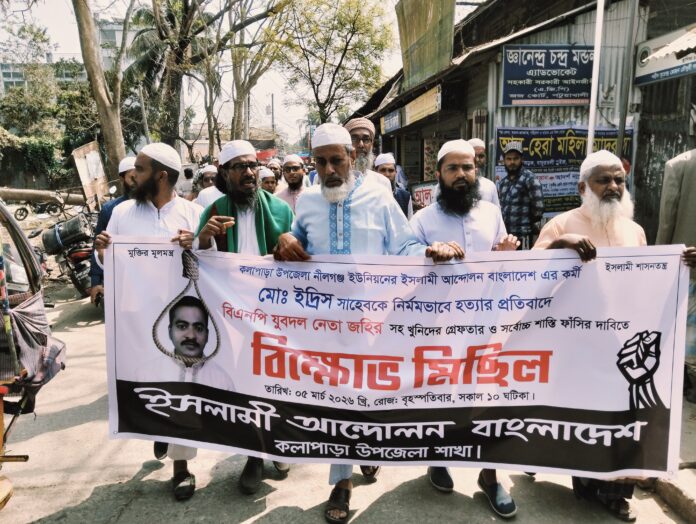 কলাপাড়া প্রতিনিধি : চরমোনাই পীর সমর্থিত ইসলামী আন্দোলন বাংলাদেশ পটুয়াখালীর কলাপাড়ার সমর্থক ইদ্রিস খানকে অফিসে ডেকে নিয়ে নির্যাতন ও মৃত্যুর ঘটনায় জড়িত নীলগঞ্জ ইউনিয়নের প্যানেল চেয়ারম্যান ও যুবদলের সাধারণ সম্পাদক জহিরুল ইসলামকে অবিলম্বে গ্রেফতার ও দৃষ্টান্তমূলক শাস্তির দাবিতে বিক্ষোভ মিছিল ও সমাবেশ অনুষ্ঠিত হয়েছে।