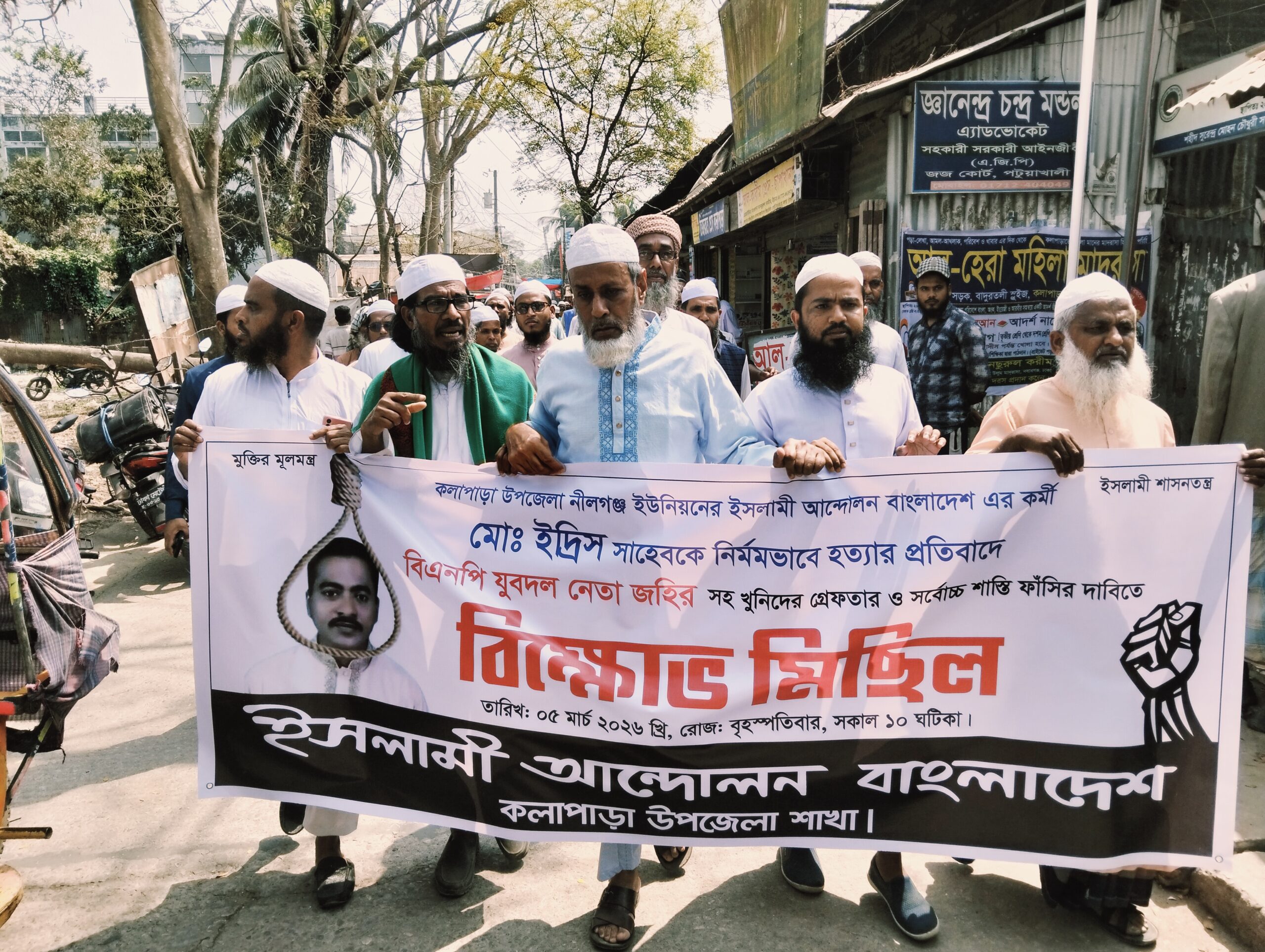 বৃহস্পতিবার সকাল সোয়া ১১ টায় কলাপাড়া ইসলামী আন্দোলন বাংলাদেশের আয়োজনে কুমারপর্টি দলীয় কার্যালয় থেকে বিক্ষোভ মিছিল টি বের হয়। মিছিল টি কলাপাড়া পৌর শহরের প্রধান প্রধান সড়ক প্রদক্ষিণ করে প্রেসক্লাবের সামনে এ প্রতিবাদ সমাবেশ অনুষ্ঠিত হয়।