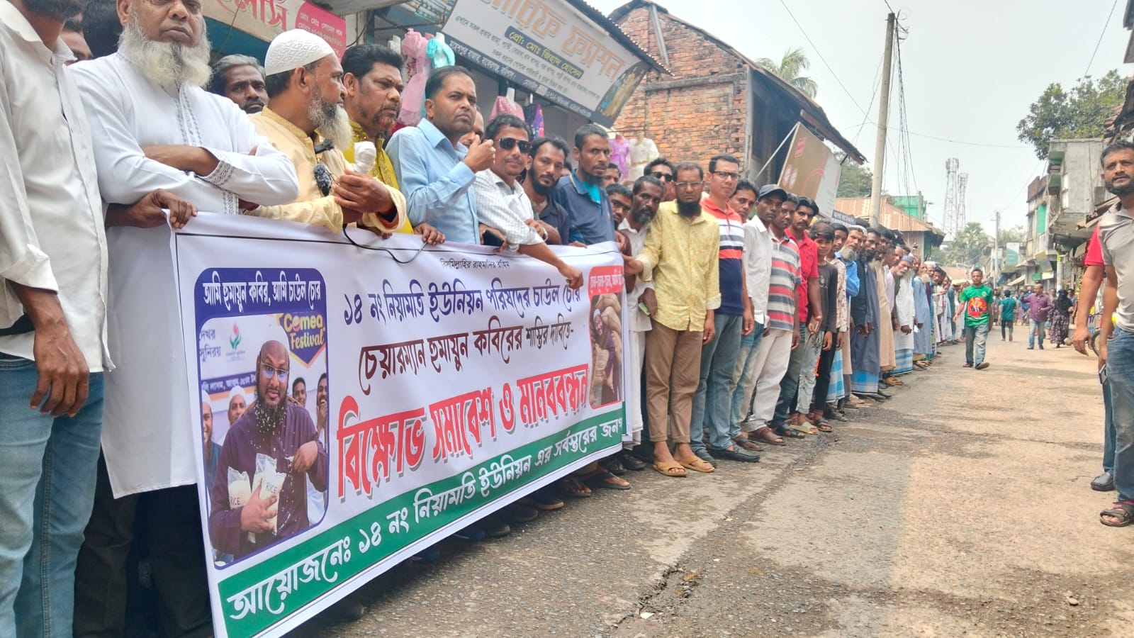 মানববন্ধন থেকে বিক্ষুব্ধ নারী-পুরুষ চেয়ারম্যান হুমায়ুন কবিরের বিভিন্ন কর্মকাণ্ডের বিরুদ্ধে তীব্র ক্ষোভ প্রকাশ করেন এবং তার অপসারণ ও দৃষ্টান্তমূলক শাস্তির দাবি জানান। উল্লেখ গত ৯ মার্চ সরকারি উদ্যোগে দুস্থ মহিলাদের খাদ্য সহায়তা প্রোগ্রাম (ভি. ডব্লিউ. ভি) এর এক হাজার তিনশত কেজি চাল চুরির অভিযোগে ইউনিয়ন চেয়ারম্যান হুমায়ুন কবিরকে ইউনিয়ন পরিষদে অবরুদ্ধ করে শারীরিক ভাবে লাঞ্ছিত করে সাধারণ জনগন।