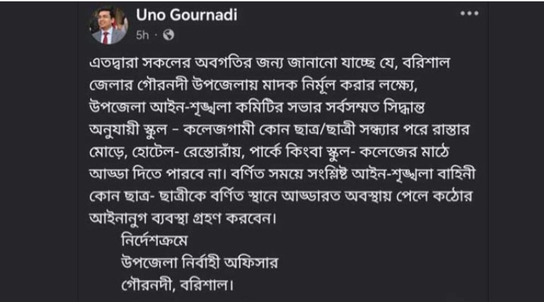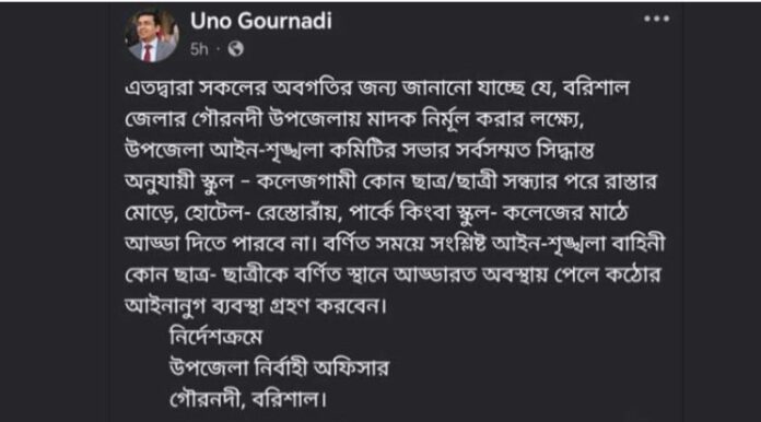 নির্দেশনায় বলা হয়, বরিশাল জেলার গৌরনদী উপজেলায় মাদক নির্মূলের লক্ষ্যে উপজেলা আইন-শৃঙ্খলা কমিটির সভার সর্বসম্মত সিদ্ধান্ত অনুযায়ী স্কুল-কলেজগামী কোনো ছাত্র-ছাত্রী সন্ধ্যার পর রাস্তার মোড়, হোটেল-রেস্তোরাঁ, পার্ক কিংবা স্কুল-কলেজের মাঠে আড্ডা দিতে পারবে না। বর্ণিত সময়ে আইন-শৃঙ্খলা বাহিনী কোনো শিক্ষার্থীকে এসব স্থানে আড্ডারত অবস্থায় পেলে তাদের বিরুদ্ধে কঠোর আইনানুগ ব্যবস্থা নেওয়া হবে।