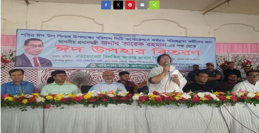 বুধবার বরিশাল টাউন হলে সদ্য যোগদানকারী নগর প্রশাসক বিলকিস জাহান শিরিন আনুষ্ঠানিকভাবে প্রধানমন্ত্রীর উপহার বিতরণ করেন। বরিশাল সিটি কর্পোরেশনের ১,৩৭৮ দৈনিক মজুরি ভিত্তিক কর্মচারীর মধ্যে ৭০৮ জন পরিচ্ছন্নতা কর্মী।