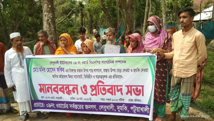 (পটুয়াখালী)প্রতিনিধিঃ পটুয়াখালীর দুমকি উপজেলার লেবুখালি ইউনিয়নের ৯ নং ওয়ার্ড বিএনপির সাংগঠনিক সম্পাদক মোঃ মনিরুল ইসলাম ফকিরের বিরুদ্ধে চলাচলের রাস্তায় গাছ লাগানোর অভিযোগে গত ২৬ মার্চ কিছু অন লাইন পোর্টালে প্রকাশিত সংবাদের প্রতিবাদে মানববন্ধন ও প্রতিবাদ জানিয়েছেন এলাকাবাসী। রবিবার সকাল ১০ টায় উপজেলার লেবুখালি ৯ নং ওয়ার্ডের শরীফ বাড়ির সামনে সড়কে এ কর্মসুচি পালন করে এলাকাবাসী।