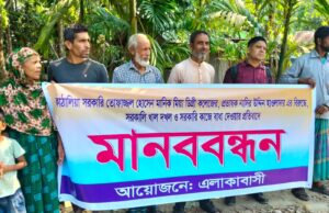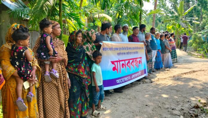 সোমবার (৬ এপ্রিল) সকালে উপজেলার পাড়ের খাল এলাকায় আয়োজিত এই মানববন্ধনে স্থানীয় ভুক্তভোগী কয়েকশ গ্রামবাসী অংশ নেন।