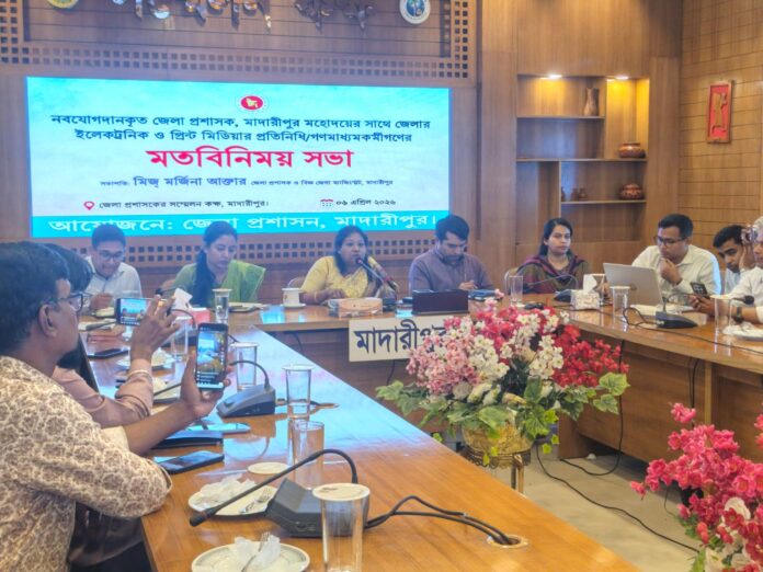 সুজন হোসেন রিফাত মাদারীপুর প্রতিনিধিঃ মাদারীপুরে কর্মরত বিভিন্ন প্রিন্ট ও ইলেকট্রনিক মিডিয়ার সাংবাদিকদের সাথে নবযোগদানকৃত জেলা প্রশাসক মিজ মর্জিনা আক্তার এর মতবিনিময় সভা অনুষ্ঠিত হয়েছে।সোমবার দুপুরে জেলা প্রশাসনের আয়োজনে জেলা প্রশাসক সম্মেলন কক্ষে মতবিনিময় সভার আয়োজন করা হয়।