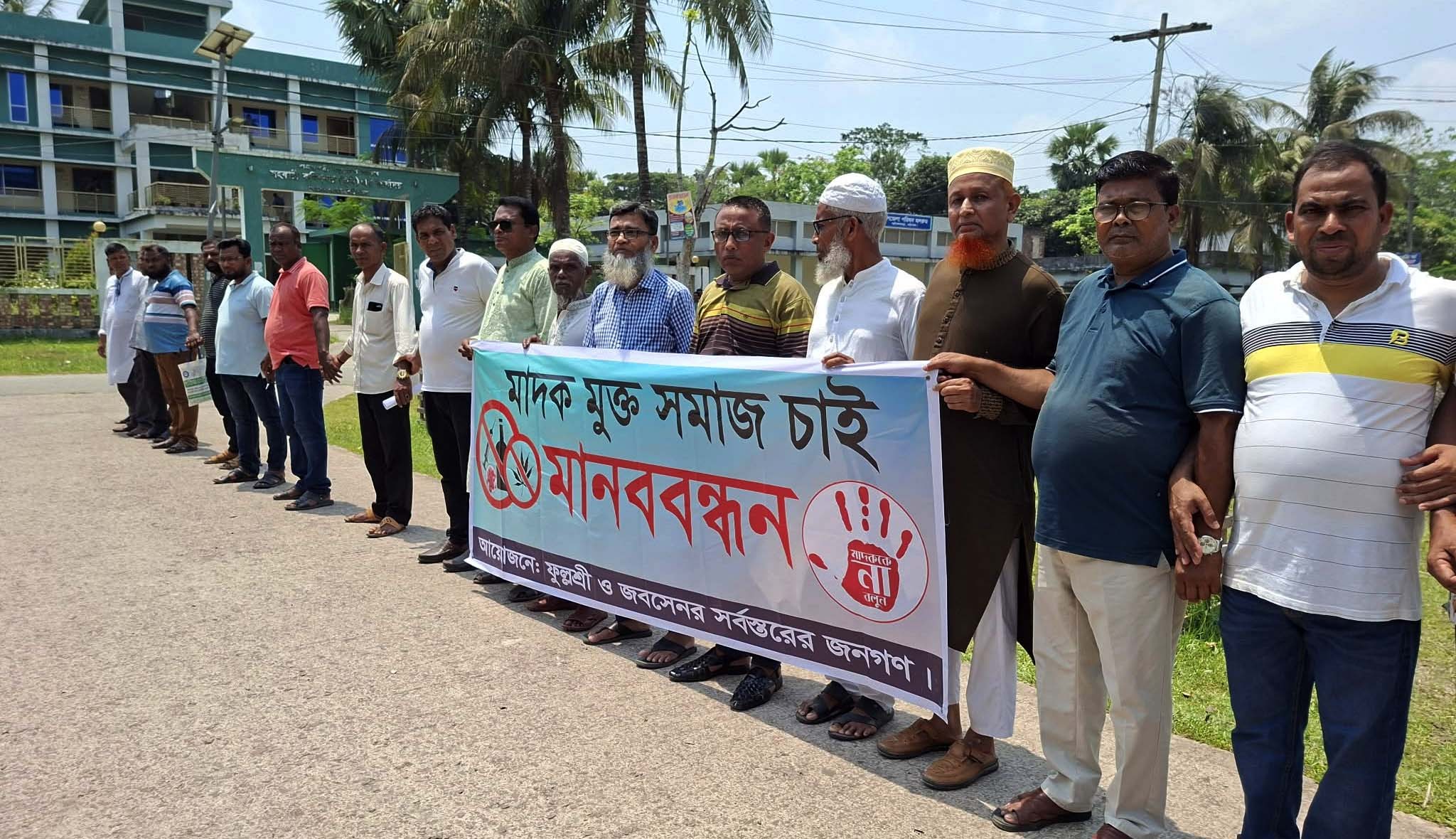 বেল্লাল ফকির, ব্যবসায়ী গিয়াস পাইক প্রমুখ। মানববন্ধন শেষে উপজেলা নির্বাহী কর্মকর্তা লিখন বনিক এর কাছে মাদক নির্মূলের জন্য ফুল্লশী গ্রামের মাদক ব্যবসায়ী জাকির, যাকাত ও ছালাম ফকিরের নাম উল্লেখ করে প্রায় তিনশত জন ফুল্লশী ও যবসেন গ্রামবাসী স্বাক্ষরিত স্মারকলিপি প্রদান করেন।