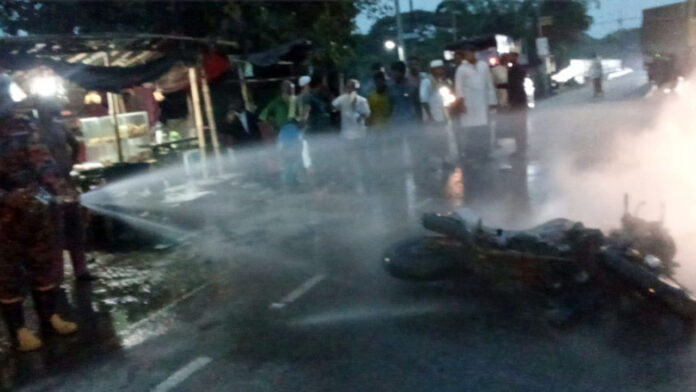 বোতল থেকে মোটরসাইকেলে তেল ভরার সময় ভয়াবহ অগ্নিকাণ্ডের ঘটনা ঘটেছে। এতে বাইকের চালক গুরুতরভাবে দগ্ধ হন। এরপর স্থানীয়রা তাকে উদ্ধার করে হাসপাতালে প্রেরণ করেন। শনিবার (১৮ এপ্রিল) ভোর সোয়া ৫টার দিকে বরিশালের গৌরনদী বাসস্ট্যান্ড সংলগ্ন গয়নাঘাটা ব্রিজের কাছে দুর্ঘটনাটি ঘটে।