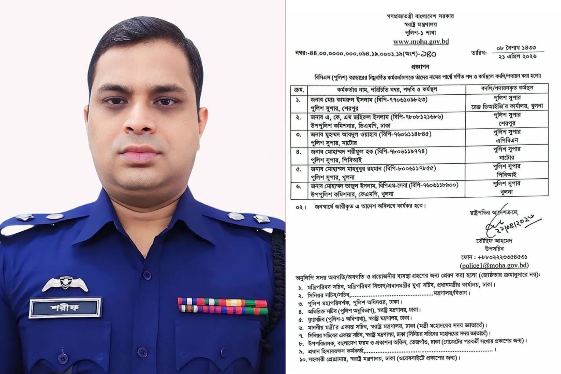 মঙ্গলবার (২১ এপ্রিল) স্বরাষ্ট্র মন্ত্রণালয়ের পুলিশ শাখা-১ থেকে জারি করা এক প্রজ্ঞাপনে এ তথ্য জানানো হয়। প্রজ্ঞাপনটি রাষ্ট্রপতির আদেশক্রমে জারি করা হয়েছে এবং এতে উপসচিব তৌছিফ আহমেদের স্বাক্ষর রয়েছে।