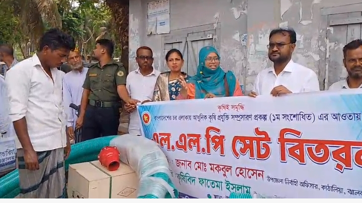 নিজস্ব প্রতিবেদক, কাঁঠালিয়া: ঝালকাঠির কাঁঠালিয়ায় চরাঞ্চলে আধুনিক কৃষি প্রযুক্তি সম্প্রসারণ প্রকল্পের আওতায় প্রান্তিক কৃষকদের ভাগ্য বদলে সরকার ব্যাপক উদ্যোগ গ্রহণ করেছে। এরই অংশ হিসেবে উপজেলার ৩৪০০ জন কৃষকের মাঝে পর্যায়ক্রমে কৃষি উপকরণ, সার ও বীজ বিতরণের ঘোষণা দেওয়া হয়েছে। আজ সকালে উপজেলা চত্বরে আয়োজিত এক অনুষ্ঠানে কৃষকদের মাঝে এলএলপি (Low Lift Pump) সেট বিতরণের মাধ্যমে এই কার্যক্রমের আনুষ্ঠানিক উদ্বোধন করা হয়।