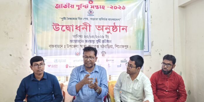 জনস্বাস্থ্য পুষ্টি প্রতিষ্ঠানের আয়োজনে ও মঠবাড়িয়া উপজেলা স্বাস্থ্য কমপ্লেক্সের বাস্তবায়নে বৃহস্পতিবার (২৩ এপ্রিল) স্বাস্থ্য কমপ্লেক্স চত্বরে একটি র্যালি বের হয়৷ র্যালি শেষে স্বাস্থ্য কমপ্লেক্স মিলনায়তনে উপজেলা স্বাস্থ্য ও পরিবার পরিকল্পনা কর্মকর্তা ডা. সাকিল সরোয়ার এ কর্মসূচির উদ্বোধন করেন।