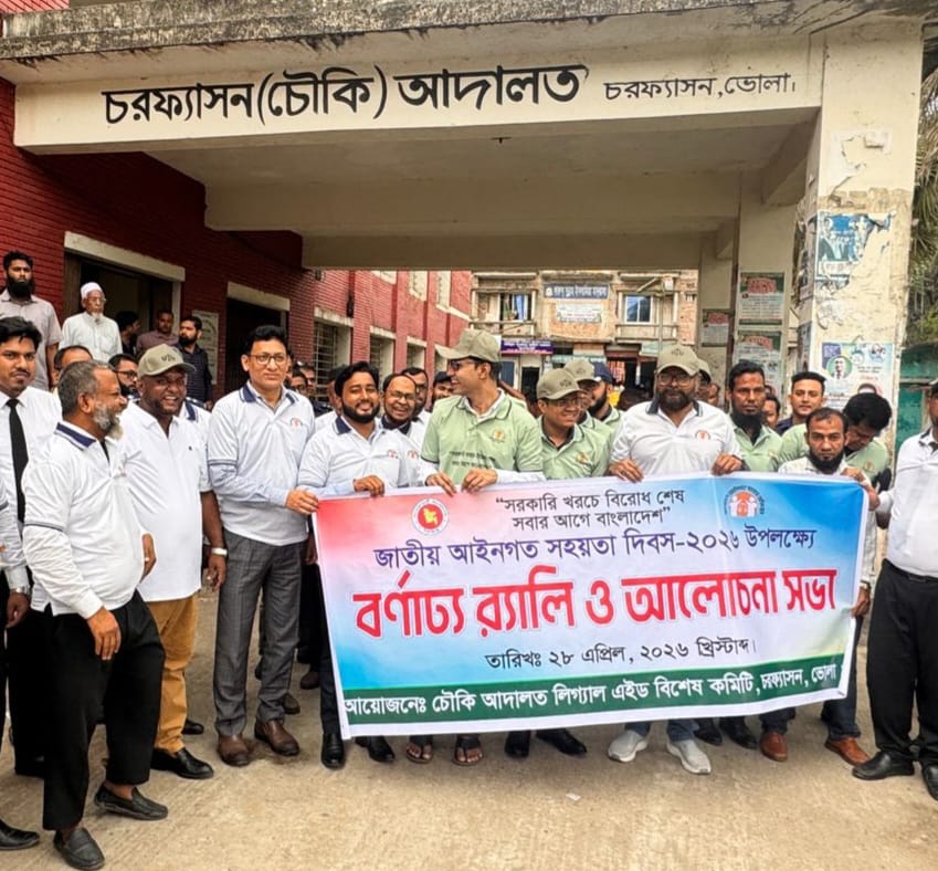 জে এইচ রাজু স্টাফ রিপোর্টার: “সরকারি খরচে বিরোধ শেষ, সবার আগে বাংলাদেশ”এই প্রতিপাদ্য সামনে রেখে ভোলার চরফ্যাশন উপজেলায়জাতীয় আইনগত সহায়তা দিবস-২০২৬ পালিত হয়ে েছ। দিবসটি উপলক্ষে আজ মঙ্গলবার সকালে বর্ণাঢ্য র্যালি ও আলোচনা সভার আয়জন করা হয়। মঙ্গলবার সকাল সাডে ১০টার দিকে চরফ্যাশন আদালত চত্বর থেকে একটি সচেতনতামূলক র্যালি বের করা হয।