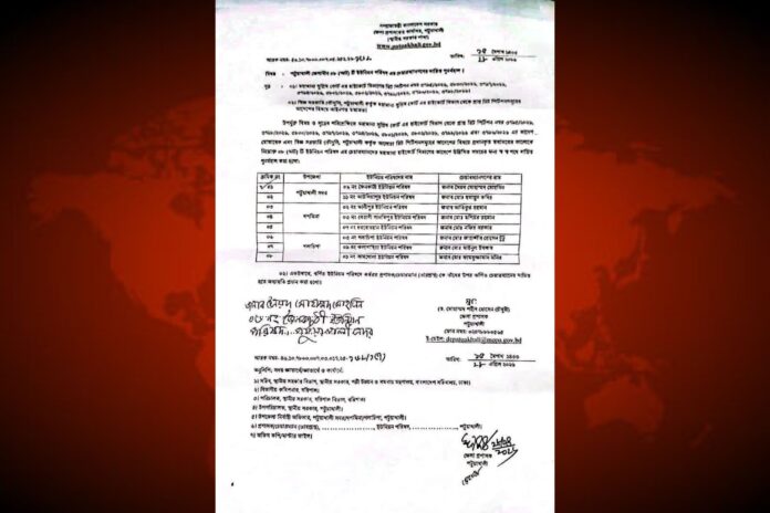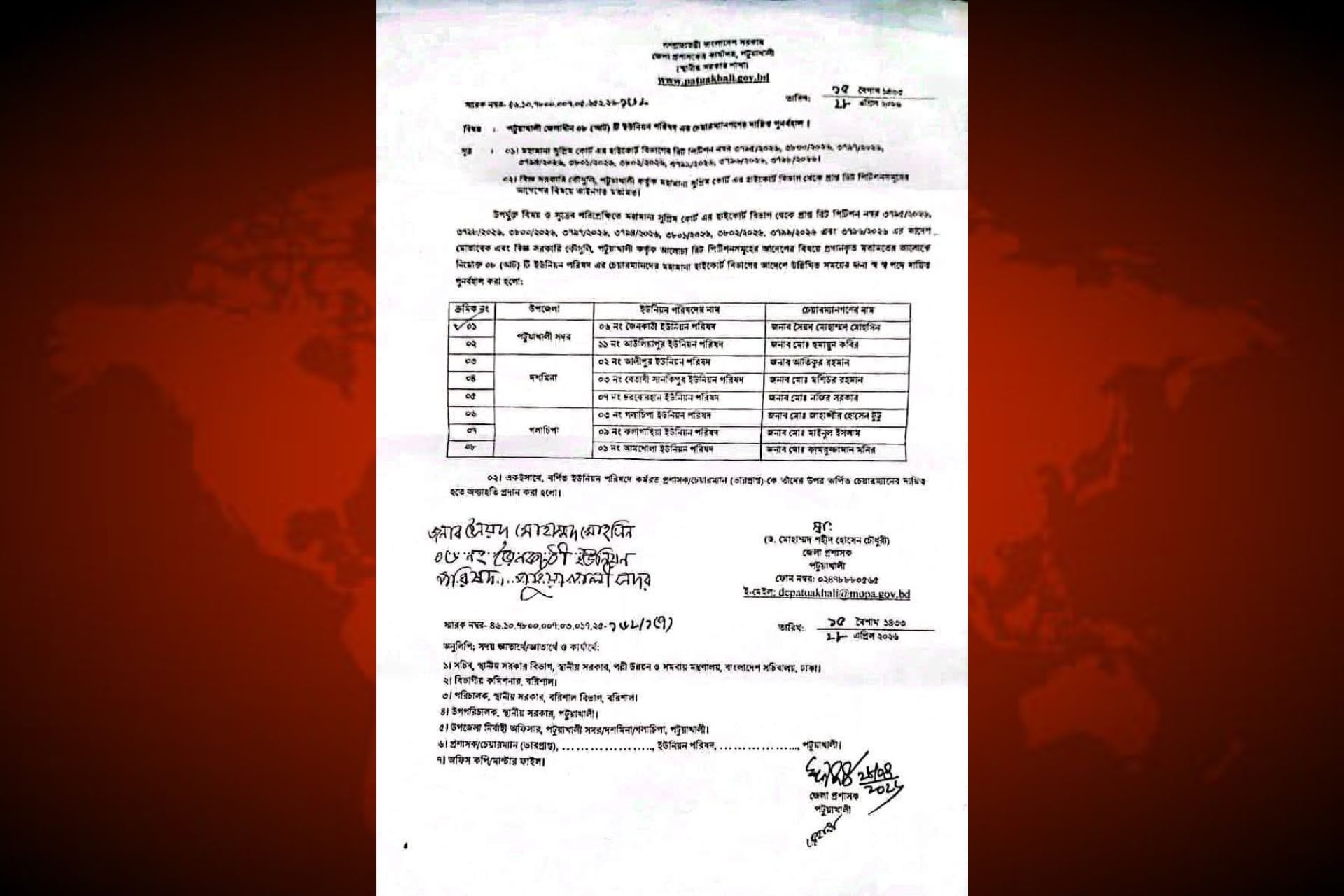 গলাচিপা উপজেলা প্রতিনিধি। বিজ্ঞ আদালতের রায়ের প্রেক্ষিতে পটুয়াখালী জেলার বিভিন্ন ইউনিয়ন পরিষদের চেয়ারম্যানদের দায়িত্ব পুনঃবহাল করে তালিকা প্রকাশ করা হয়েছে। ২৮ এপ্রিল তারিখে পটুয়াখালী জেলা প্রশাসক ড. মোহাম্মদ শহীদ হোসেন চৌধুরী স্বাক্ষরিত জারি করা অফিস আদেশে পুনর্বহালকৃত চেয়ারম্যানদের নাম উল্লেখ করা হয়েছে। প্রকাশিত তালিকা অনুযায়ী, পটুয়াখালীর ৮ ইউনিয়নের চেয়ারম্যানরা তাদের দায়িত্বে পুনরায় বহাল হয়েছেন।